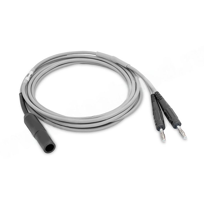 - Кабель к биполярным пинцетам 3 м. Инструментальная часть - разъем "евростандарт". Аппаратная часть - двухполюсная вилка (штекер 4 мм 2 шт.);