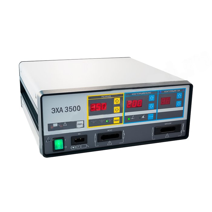- ЭХА 3500 - генератор тока высокой частоты для проведения оперативных вмешательств в условиях ветеринарной клиники. Предназначен для выполнения больших и сложных операций с обширным кровотечением в открытой и эндоскопической хирургии. Сочетает функции рассечения и коагуляции.